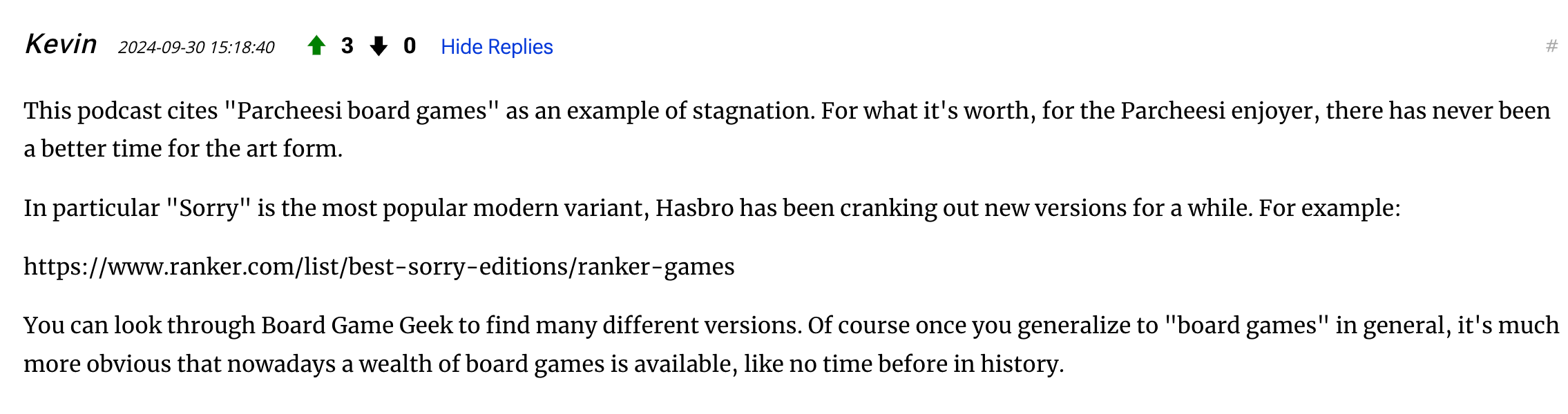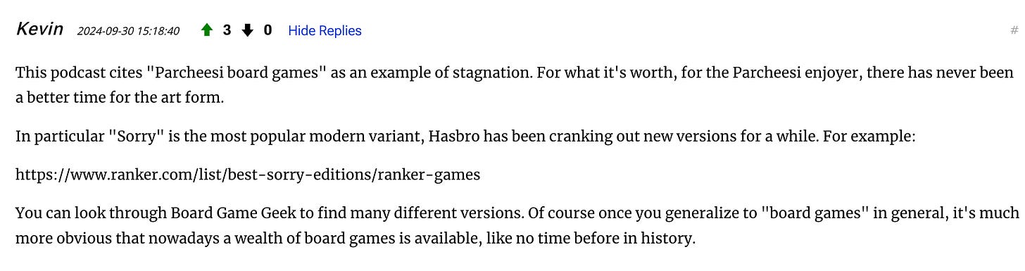 In the podcast, Tyler asked for an autist to correct him about whether Parcheesi board games have gotten worse.