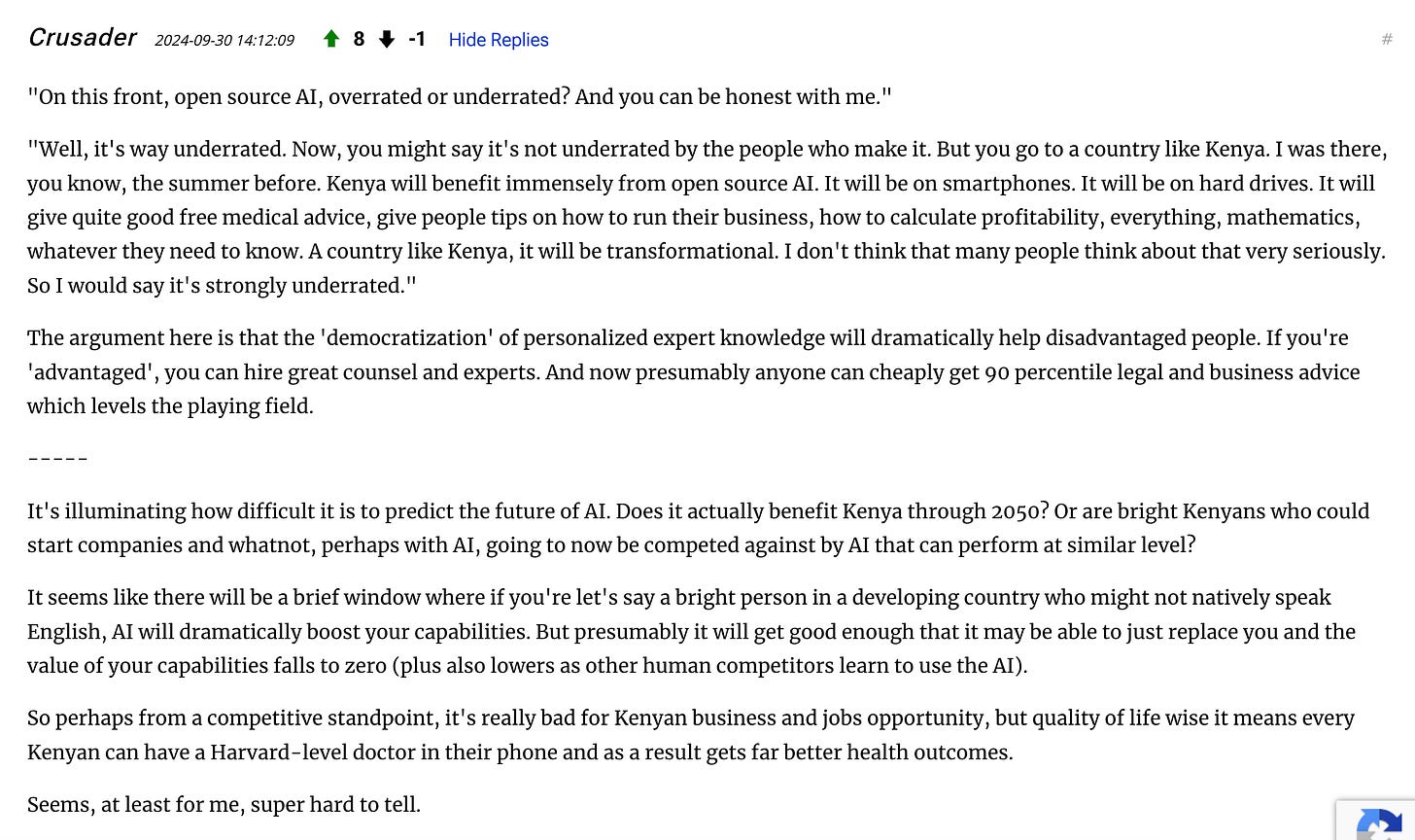 There’s a long but fun conversation about whether AI does actually benefit Kenya. I agree with Tyler on this one. I think people don’t fully conceptualize what a talent shortage is. Talent shortages are the water we swim in, in that sense.