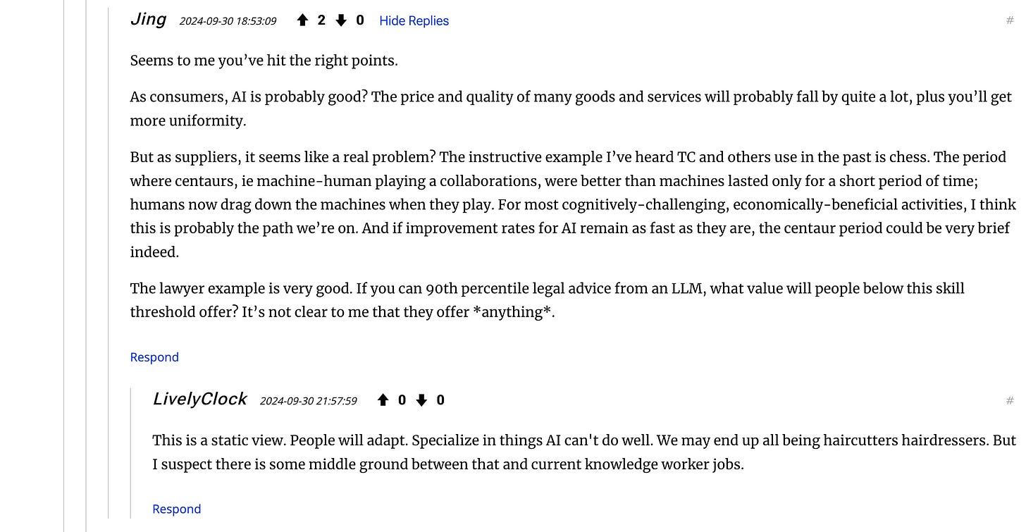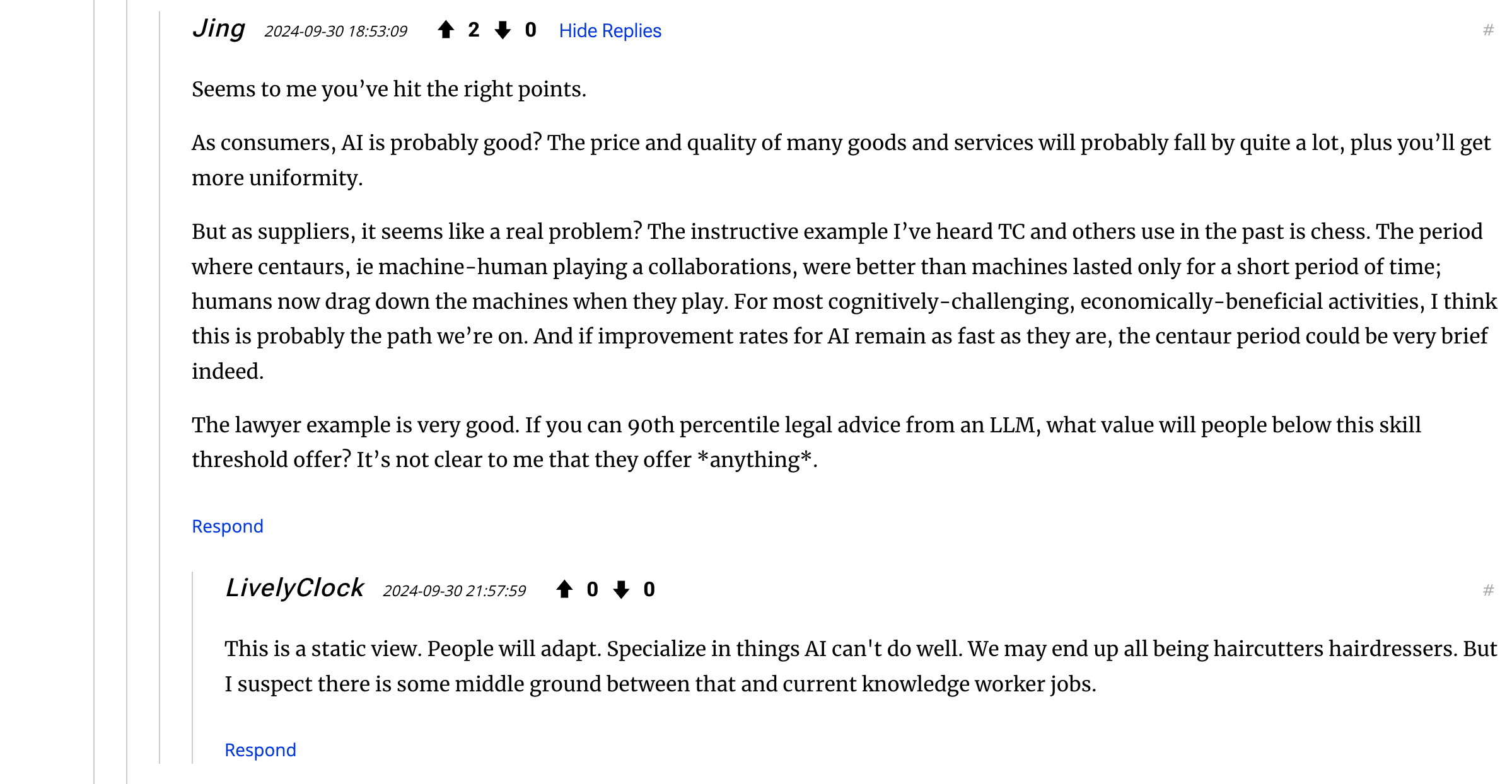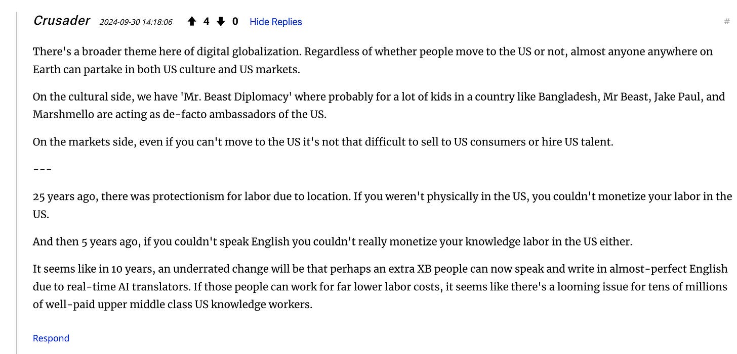 I think the subtext of the last section of our interview, the section about talent shortages (or lack thereof) is that Tyler wants us to be more hopeful about people. I don’t find his answer to my question about talent arbitrages satisfying whatsoever. But I appreciate the underlying aesthetic point.