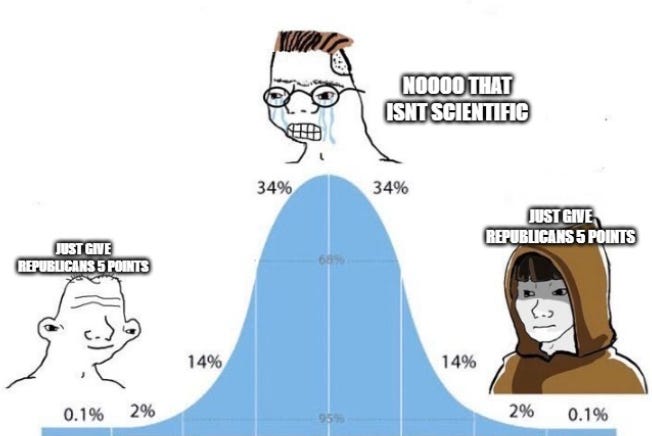 But it also strikes exactly through the hubris of the polling mythos. It requires admitting constraint. Admitting uncertainty in a way that the proles would understand. That would not be very scientific of you, despite the exact same boilerplate mathematical arguments as every other paper. You can probably tell I don’t think this is a useful way of solving the actual problems with polling. Sometimes, you just have to keep things simple.