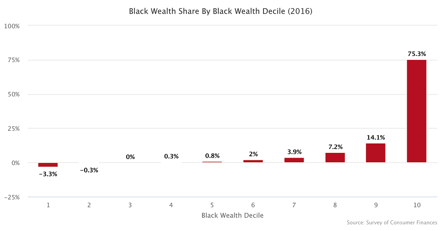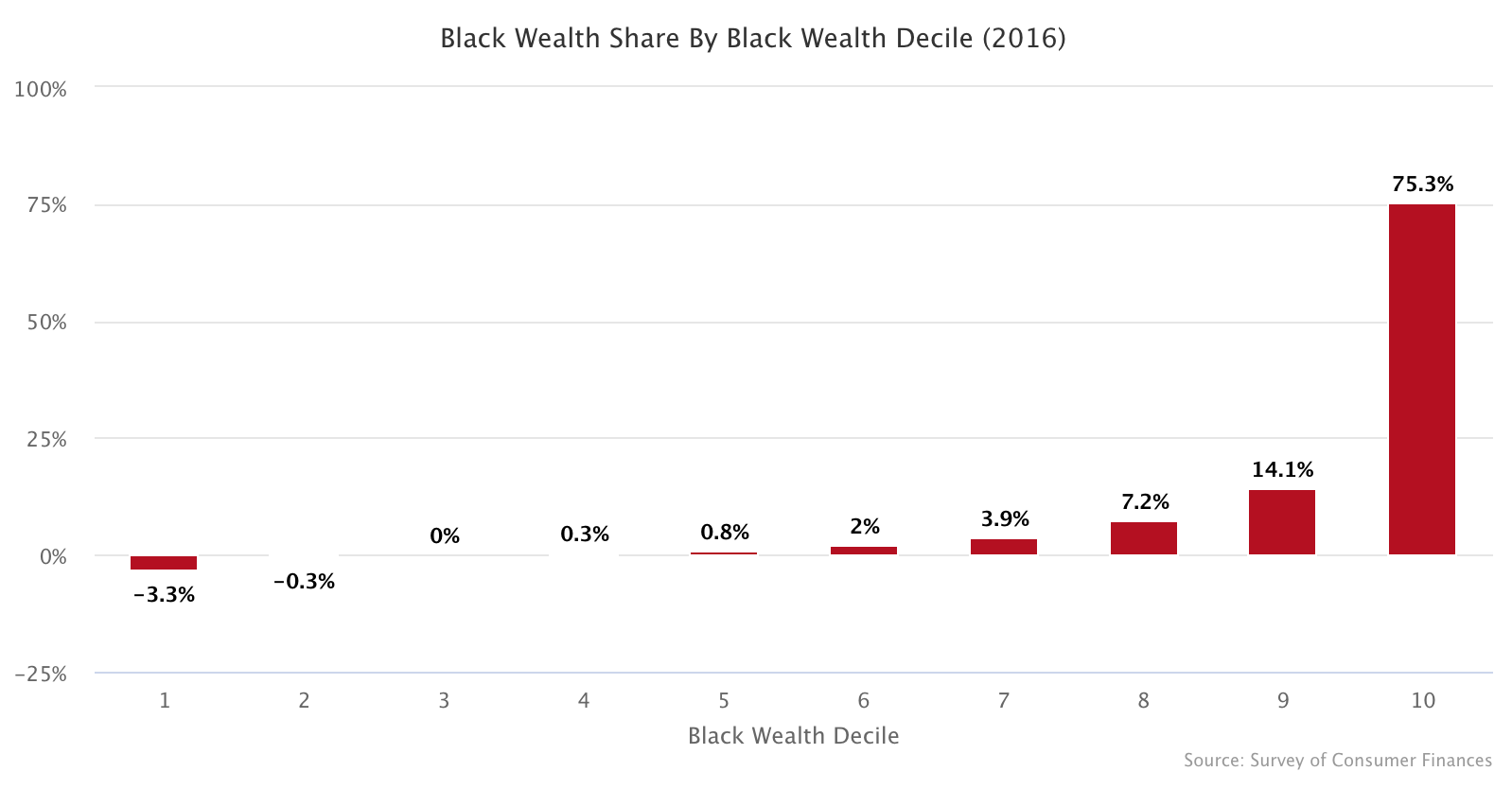 What this means is that the overall racial wealth disparity is being driven almost entirely by the disparity between the wealthiest 10 percent of white people and the wealthiest 10 percent of black people.