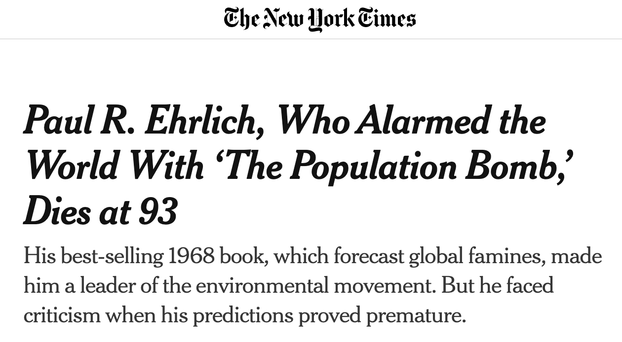 Ehrlich himself rose to stardom in a world ravaged by the delusional predictions of Thomas Malthus. Now, the Lich is resurrected in new and somehow even more retarded doomsayers, wielding even more catastrophic policy proposals, finding their spotlight in an equally gullible media landscape. Man never learns.